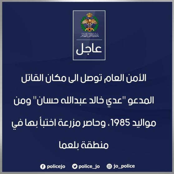 توصل جهاز الأمن العام الأردني الى مكان القاتل المدعو "عدي خالد عبدالله حسان" ومن مواليد 1985، وحاصر مزرعة اختبأ بها في منطقة بلعما.