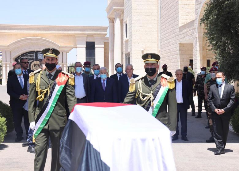وألقى الرئيس والمشاركون نظرة الوداع الأخيرة على جثمانه، ووضع على نعشه إكليلا من الزهور، وذلك قبل أن يتوجه الموكب الجنائزي إلى مسقط رأسه بلدة الظاهرية جنوب الخليل، لإلقاء نظرة الوداع عليه، ومواراته الثرى.