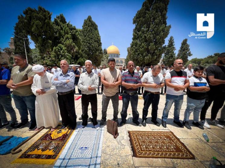 وأفادت مصادر محلية بأن ساحات المسجد الأقصى شهدت توافد عشرات آلاف المصلين إليها منذ الصباح، وسط تواجد مكثّف لقوات الاحتلال عند أبواب الأقصى وأبواب البلدة القديمة، والتي ضيّقت على المصلين من خلال تفتيشهم وتفتيش هوياتهم أو احتجازها.
