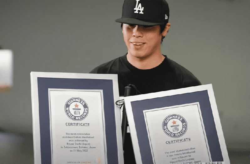 حطم متزلج ياباني فقد 95% من بصره بسبب المرض رقمين قياسيين في موسوعة غينيس للأرقام القياسية من خلال أداء 33 قفزة أولية في دقيقة واحدة وهو معصوب العينين، ثم 122 قفزة أولية متتالية وهو معصوب العينين.