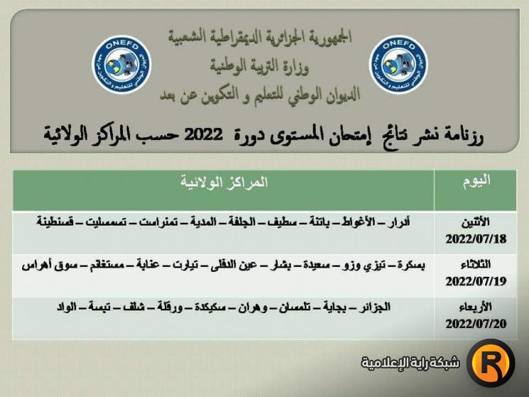ووفق رزنامة نشر نتائج امتحان المستوى دورة 2022 حسب المراكز الولائية الصادرة عن الديوان الوطني للتعليم والتكوين عن بعد التابع لوزارة التربية الوطنية في الجمهورية الجزائرية، تكون النتائج المعلنة كما يلي: