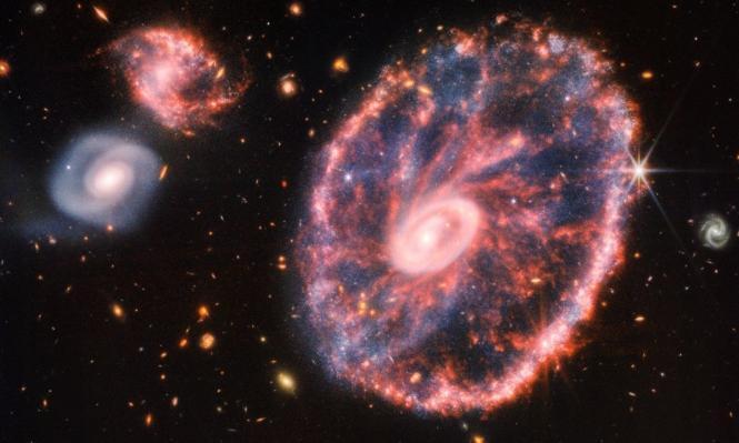 نشرت وكالة الفضاء الأميركية "ناسا"، الثلاثاء، صورة نادرة ومذهلة لمجرّة تبعد 500 مليون سنة ضوئية هي مجرّة عجلة العربة التي تظهر حلقاتها بوضوح لم يسبق له مثيل بفضل تلسكوب جيمس ويب الفضائي الجديد.