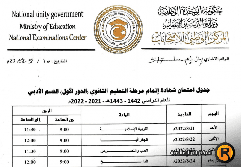 جدول امتحانات شهادة إتمام مرحلة التعليم الثانوي الدور الأول 2022 في ليبيا القسم الأدبي والعلمي الذي أعلن عنه الديوان الوطني للامتحانات في وزارة التربية والتعليم الليبية بحكومة الوحدة الوطنية.