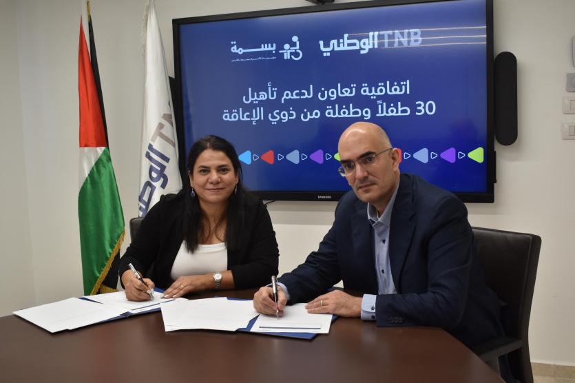 وقّع البنك الوطني ومؤسسة الأميرة بسمة الخيرية بالقدس، اتفاقية تعاون لدعم تأهيل ورعاية 30 طفلا وطفلة فلسطينيين من ذوي الإعاقة الذين يتلقون العلاج في المؤسسة بهدف دمجهم في المجتمع.