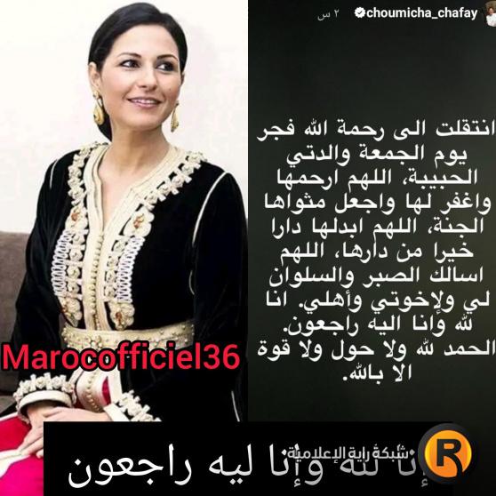 وأكدت الشاف والإعلامية المغربية "شميشة الشافعي" عن خبر وفاة والدتها، في الساعات الأولى من يوم الجمعة الماضي، وذلك عبر تدوينة نشرتها على صفحتها بموقع إنستغرام.