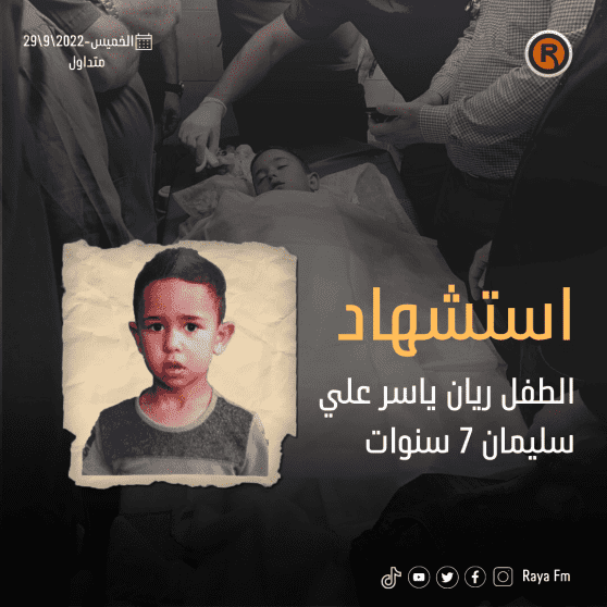 واستشهد الطفل الفلسطيني ريان سليمان، بعد مطاردة جيش الاحتلال لطلبة المدارس من بلدة تقوع، جنوب شرق مدينة بيت لحم .