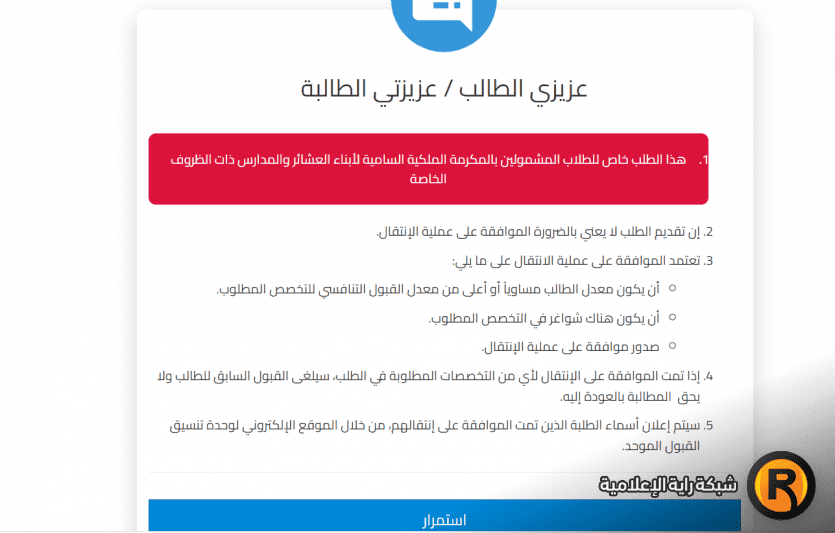 ووفق طلب القبول الموحد على الصفحة الرسمية،  هذا الطلب خاص للطلاب المشمولين بالمكرمة الملكية السامية لأبناء العشائر والمدارس ذات الظروف الخاصة، وأن تقديم الطلب لا يعني بالضرورة الموافقة على عملية الإنتقال.