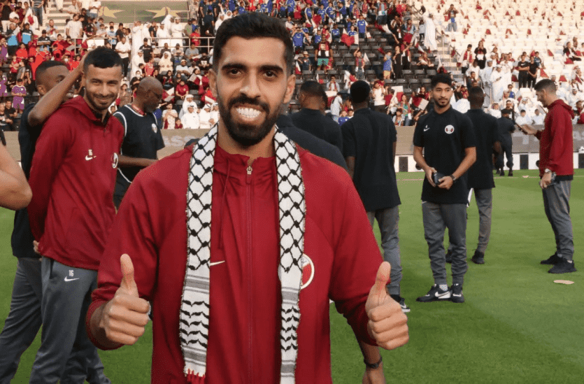 توشح كابتن منتخب قطر الأول لكرة القدم حسن الهيدوس الكوفية الفلسطينية، خلال التدريبات التي جرت بالدوحة، في لفتة تدل على التضامن مع القضية الفلسطينية.
