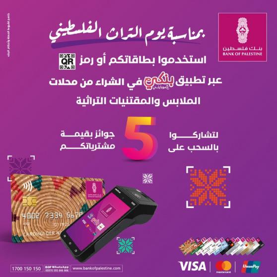أطلق بنك فلسطين حملة جديدة، بمناسبة يوم التراث الفلسطيني الذي يصادف في السابع من شهر اكتوبر من كل عام، تحت شعار "تراثنا هويتنا"، وذلك انسجاماً مع سعيه المتواصل للتميز بمكافأة عملائه وتشجيعهم على شراء الألبسة والمقتنيات التراثية من خلال المحلات المختصة في بيعها، والتي لديها ماكنات نقاط للبيع التابعة لبنك فلسطين.