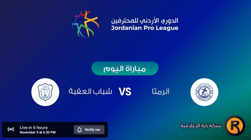 مباراة شباب العقبة والرمثا مباشر يسبقها استيديو تحليلي مهم على قناة الأردن الرياضية ومنصات الاتحاد الأردني لكرة القدم، إذ تنطلق في تمام الساعة السادسة والنصف بتوقيت عمان والقدس المحتلة والقاهرة وطرابلس.