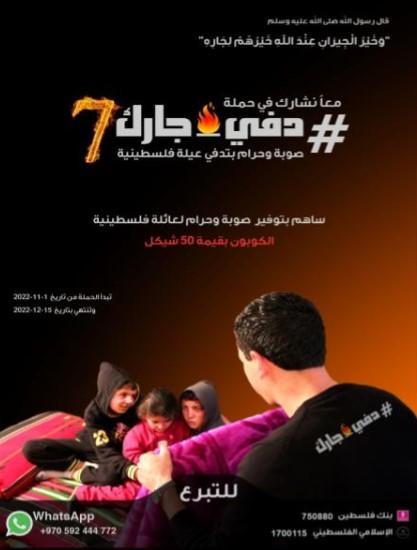 أعلنت جمعية إنعاش الأسرة عن إطلاق حملة (دفي جارك) للسنة السابعة، والتي تبدأ في تاريخ (01/11/2022) وتنتهي في تاريخ (15/12/2022). وذلك بهدف إسناد الأسر الفلسطينية الفقيرة من مختلف محافظات الوطن في فصل الشتاء عبر توفير مستلزمات الشتاء من بطانيات ومدافئ. نجحت الحملة في السنوات السابقة في إيصال الدفء لمئات الأسر الفلسطينية ونسعى في هذا العام للوصول لعدد أكبر.