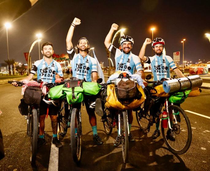 أعرب أربعة مشجعين من الأرجنتين، وصلوا إلى الدوحة، بالدراجات الهوائية، قادمين من جنوب أفريقيا، لتشجيع منتخب بلادهم في كأس العالم FIFA قطر 2022™، عن سعادتهم بالوصول أخيراً إلى أرض المونديال، وتطلعهم إلى أن تسهم رحلتهم، التي استمرت على مدى 177 يوماً، في تغيير التصورات والأفكار المغلوطة عن العالم العربي والمنطقة.