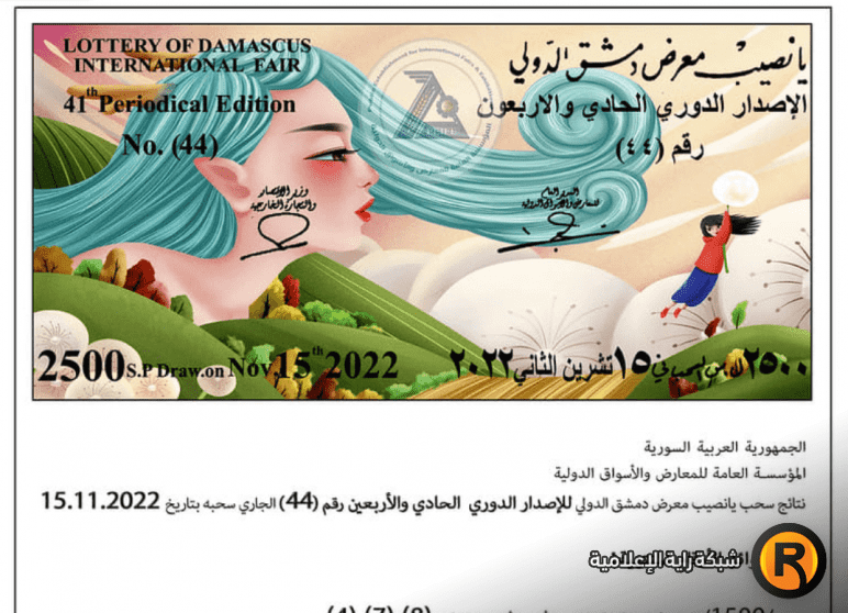 نتائج سحب يانصيب معرض دمشق الدولي اليوم الثلاثاء 15 / 11 / 2022 ربحت 1500 ليرة سورية كل بطاقة تنتهي بأحد الأرقام التالية 8 أو 7 أو 4، فيما تربح 2500 ليرة سورية كل بطاقة تنتهي بالأرقام 55 أو 89 أو 31.