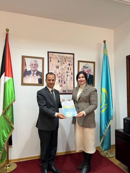 وقدمت رئيسة تحرير صحيفة "President “ لسفير دولة فلسطين لدى كازاخستان، د. منتصر أبو زيد، شهادة تقدير لتعاونه العالي والفعال مع ادارة الصحيفة طوال الفترة السابقة، وأهدت السفير كتاب عن انجازات الصحيفة وما نشرته خلال العامين الماضيين.