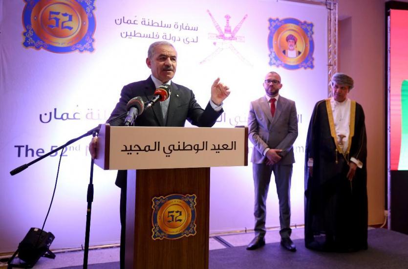 وتابع رئيس الوزراء: "هذا اليوم مناسبة طيبة على قلوبنا كفلسطينيين الذي فيه باسم السيد الرئيس محمود عباس نتقدم بالتهنئة والتبريك لجلالة السلطان هيثم بن طارق وأهلنا في سلطنة عمان، على ما حققته من إنجازات في سجل تاريخ هذا البلد العزيز على قلب كل فلسطيني، بما تم إنجازه والرؤية المستقبلية التي عبرت عنها قيادة السلطنة".