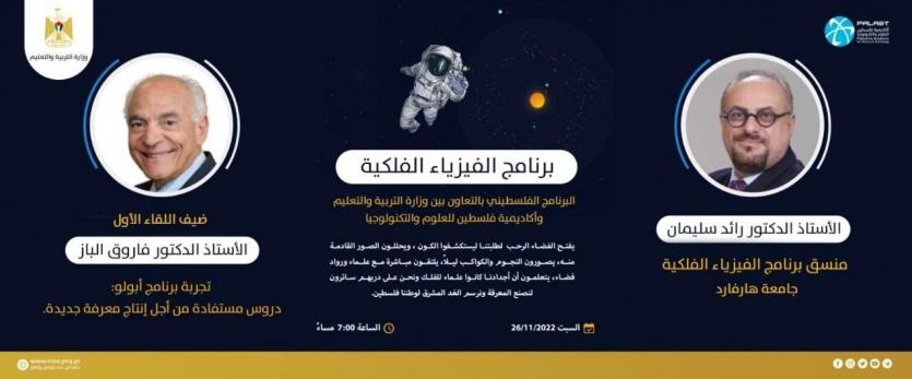 تطلق وزارة التربية والتعليم بالتعاون مع أكاديمية فلسطين للعلوم والتكنولوجيا، في الساعة السابعة من مساء اليوم السبت، افتراضياً، برنامج فلسطين للفيزياء الفلكية؛ بمشاركة من علماء فلسطينيين وعرب.