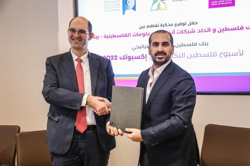 وقع بنك فلسطين مع اتحاد شركات أنظمة المعلومات الفلسطينية-بيتا، اتفاقية رعاية أسبوع فلسطين التكنولوجي إكسبوتك 2022 في نسخته الـ18، والذي سينظم هذا العام في مدينة رام الله بفندق ميلينيوم – رام الله، بالتوازي مع قطاع غزة في فندق الروتس تحت شعار " The Interconnected Power of Technology Palestine Meets Digital".