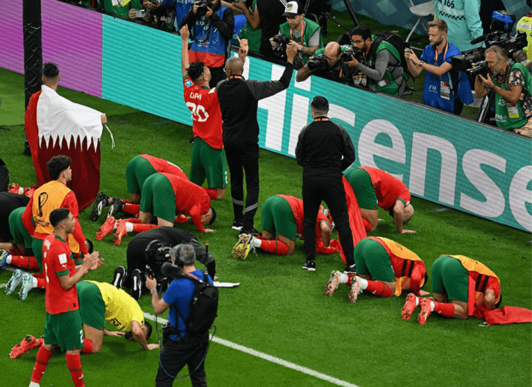 حرص لاعبو منتخب المغرب، على السجود شكرا لله، بعد الفوز في مباراة البرتغال (1-0)، بربع نهائي كأس العالم (قطر 2022).