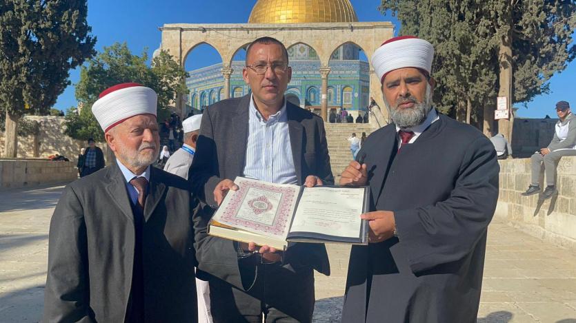وسلم المفتي العام للقدس والديار الفلسطينية الشيخ محمد حسين، ومستشار ديوان الرئاسة لشؤون القدس أحمد الرويضي، اليوم الجمعة، النسخة من المصحف الشريف إلى مدير المسجد الأقصى المبارك الشيخ عمر الكسواني.