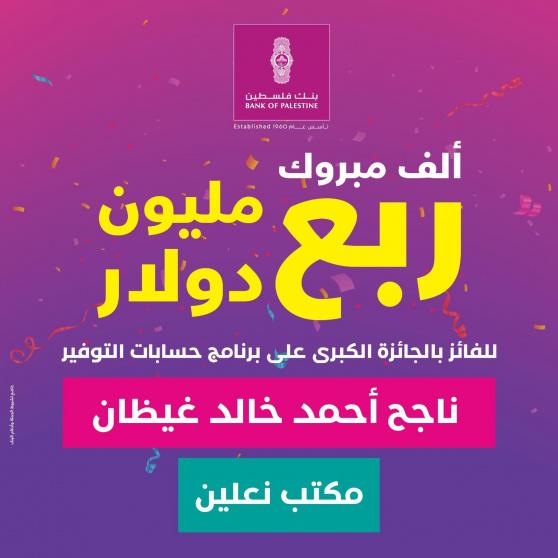 أعلن بنك فلسطين عن اسم الفائز بالجائزة الكبرى لحسابات التوفير الشهرية، والتي تبلغ قيمتها 250 ألف دولار أمريكي، وذلك ضمن الحملة التي أطلقها بنك فلسطين على برنامج حسابات التوفير في كافة فروعه المنتشرة بمختلف محافظات الوطن.