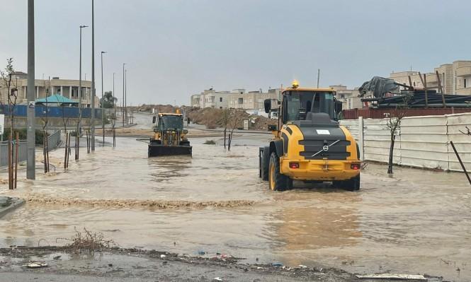 وفي مدينة رهط بمنطقة النقب، جنوبي البلاد، تدفقت مياه الأمطار الغزيرة على شوارع رئيسة وأغرقتها.