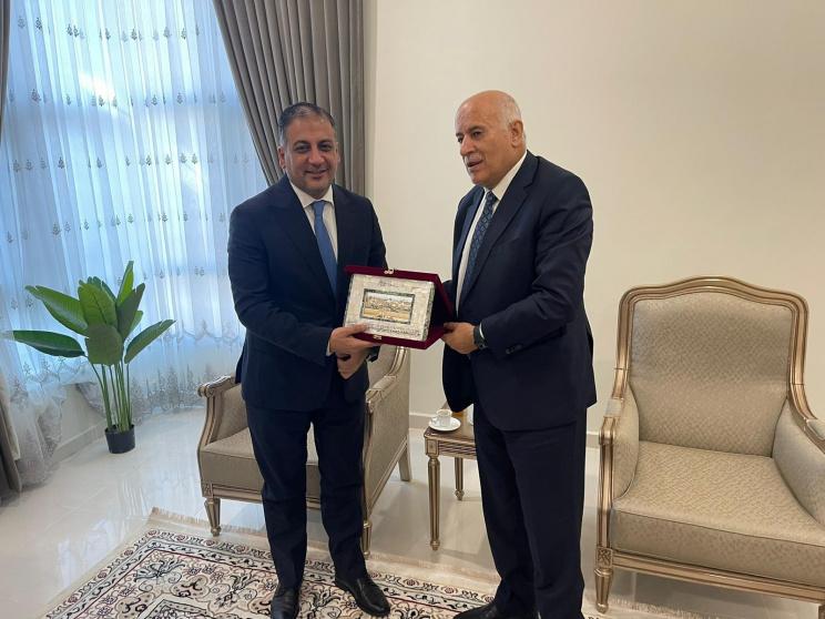 وجرى خلال اللقاء استعراض العلاقات الثنائية بين البلدين الشقيقين فيما يتعلق بجانبي الشباب والرياضة، بحضور عضو المكتب التنفيذي للاتحاد الفلسطيني لكرة القدم تيسير نصر الله، وسفير دولة فلسطين لدى العراق أحمد عقل.