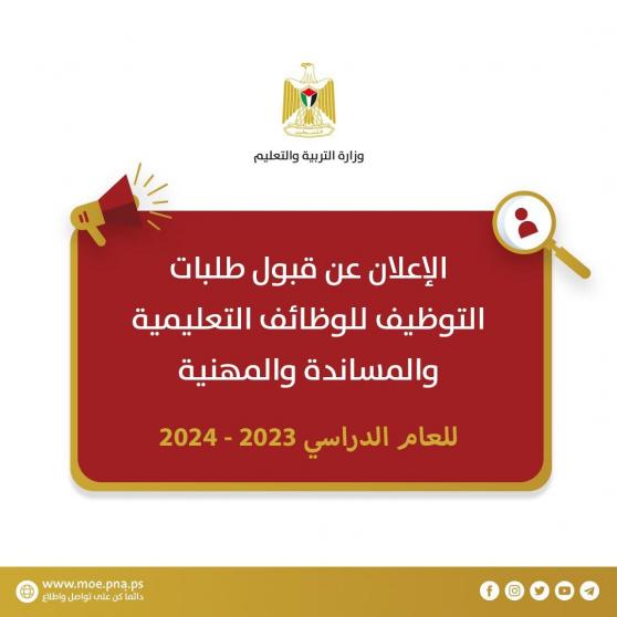 ودعت "التربية" الراغبين بتقديم الطلبات لهذه الوظائف زيارة البوابة الإلكترونية لديوان الموظفين العام www.gpc.pna.ps. وللتعرف على متطلبات التوظيف من خلال موقع الوزارة www.moe.pna.ps .