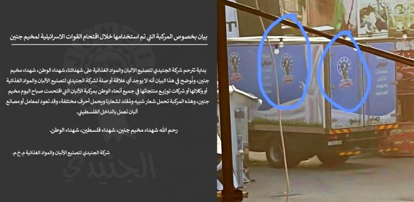 بداية تترحم شركة الجنيدي لتصنيع الالبان والمواد الغذائية على شهدائنا، شهداء الوطن، شهداء مخيم جنين، ونُوضح في هذا البيان أنه لا يوجد أي علاقة أو صلة لشركة الجنيدي لتصنيع الألبان والمواد الغذائية أو وكلائها أو شركات توزيع منتجاتها في جميع أنحاء الوطن بمركبة الألبان التي اقتحمت صباح اليوم مخيم جنين، وهذه المركبة تحمل شعار شبيه ومُقلد لشعارنا ويحمل أحرف مختلفة، وقد تعود لمعامل أو مصانع  ألبان تعمل بالداخل الفلسطيني.