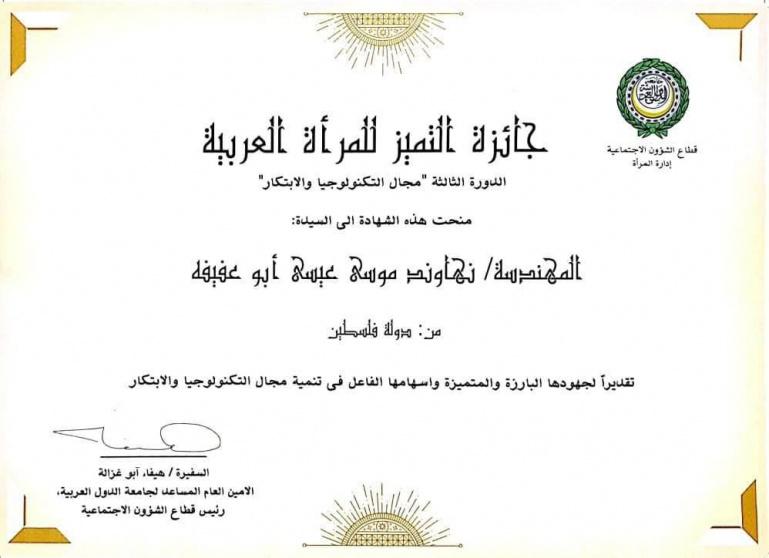 منحت جامعة الدول العربية المهندسة نهاوند أبو عفيفة جائزة التميز للمرأة العربية في مجال التكنولوجيا والابتكار في دورتها الثالثة لعام 2022، وذلك تقديرا لجهودها البارزة والمتميزة واسهامها الفاعل في تنمية مجال التكنولوجيا والابتكار.
