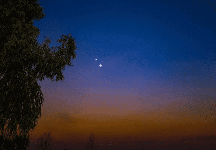 من جهتها، نشرت الجمعية الفلكية الفلسطينية، مساء اليوم، صورة لـ "الاقتران العظيم" بين كوكبي الزهرة والمشتري في سماء فلسطين.