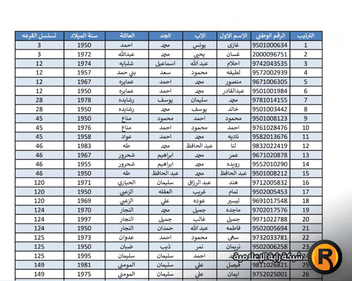 وتضمنت قائمة أسماء حجاج القرعة في الأردن للموسم 1444 هجري، الأسماء كاملة من الاسم الأول والأب والجد والعائلة بالإضافة إلى تاريخ ميلاد الحاج المُسجل في القرعة وأيضا تسلسل القرعة إلى جانب الرقم الوطني والترتيب كاملا.