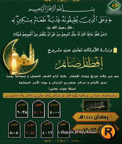 وأعلنت وزارة الاوقاف السورية عن مشروع إفطار صائم الذي يتم من خلاله توزيع وجبات الإفطار طيلة أيام شهرر مضان المبارك وإيصالها يوميا لدور الأيتام ومراكز متضرري الزلزال وبيوت الأسر المحتاجة في المحافظات بسوريا.