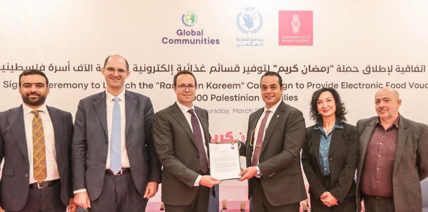 وجرى توقيع الاتفاقية هذا اليوم الجمعة الموافق 23/3/2023 في مبنى المركز الرئيسي للإدراة العامة لبنك فلسطين في مدينة رام الله، بحضور هاشم الشوا رئيس مجلس إدارة مجموعة بنك فلسطين، وسامر عبد الجابر المدير التنفيذي وممثل عن برنامج الأغذية العالمي (WFP) في فلسطين، ومحمود الشوا، المدير العام للبنك، ولنا أبو حجلة مديرة منظمة مجتمعات عالمية، وثائر حمايل مدير عام شركة PalPay، وبمشاركة عدد من مدراء الإدارات العليا والدوائر في البنك وبرنامج الغذاء العالمي ومنظمة مجتمعات عالمية.