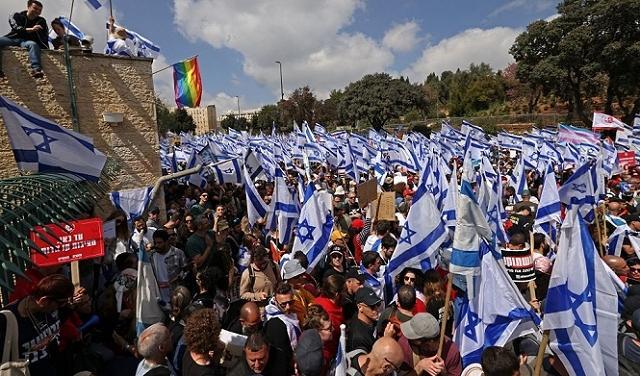 وتجمع عشرات آلاف المتظاهرين ضد خطة إضعاف القضاء في منطقة الكنيست في القدس، بعد ظهر اليوم الإثنين.