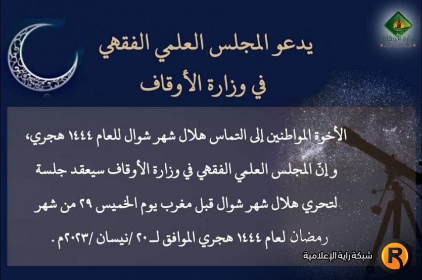 وأشارت الوزارة إلى أن المجلس العلمي الفقهي بوزارة الأوقاف سوف يعقد جلسة لتحري هلال شوال قبل مغرب يوم الخميس 29 من شهر رمضان للعام 1444 هجري الموافق 20 نيسان / ابريل 2023 ميلادي.