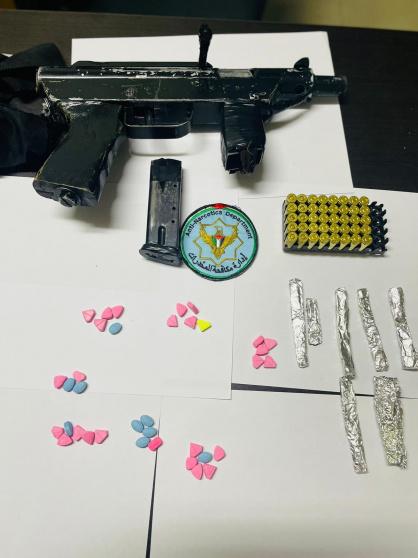 وأضاف العقيد ارزيقات أنه وأثناء عملية تفتيش المركبة التي كان يستقلها ضبطت 7 قطع من مادة يشتبه أنها مخدرة من نوع حشيش و 36 حبة يشتبه أنها حبوب الإكستازي وذخيرة وسلاحا ناريا .