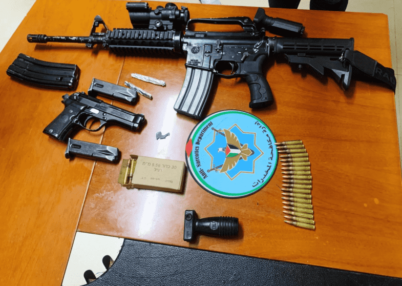 وأضافت أنه وبتفتيش المنزل أصولا تم ضبط مادة الحشيش المخدرة وقطعة سلاح من نوع m16 وذخيرتها ومقبضين m16 ومنظار ليزر ومخزنين ومسدس من نوع بريتا ومخزنين.