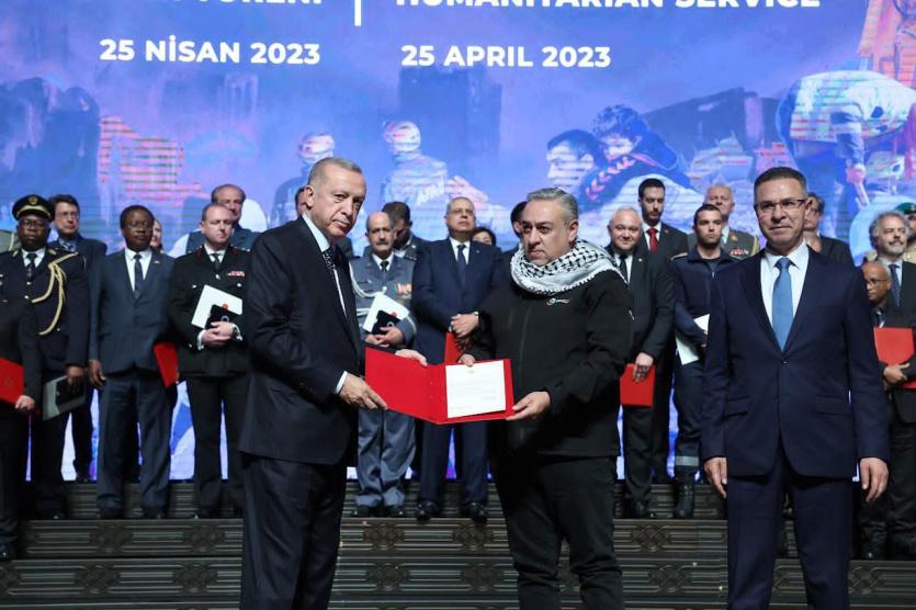كرم الرئيس التركي رجب طيب أردوغان، اليوم الثلاثاء، دولة فلسطين ممثلة بفريقها للتدخل والاستجابة لدعمها الإغاثي والإنساني لجهوده في مواجهة تداعيات الزلزال.