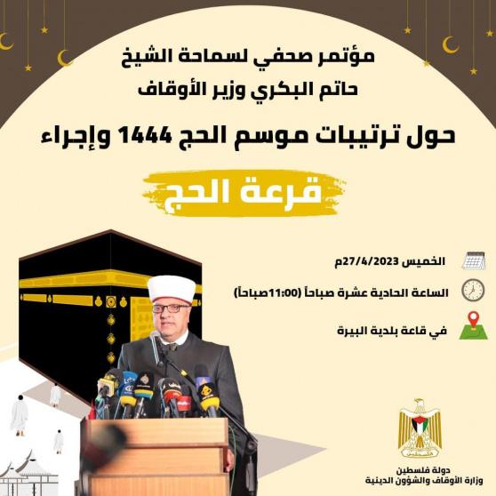 وبحسب ما ورد عبر صفحة وزارة الأوقاف والشؤون الدينية الفلسطينية على فيسبوك، فإن مؤتمر الوزير البكري حول موسم الحج 1444 يعقد الخميس 27 نيسان/ ابريل 2023 الساعة الحادية عشرة صباحا في قاعة بلدية البيرة.