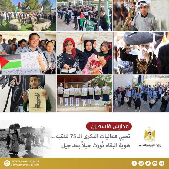 وشددت الوزارة على أن الأجيال الناشئة ستبقى متشبثة بالوعي الوطني، ووفية لعهد الشهداء ومنهم طلبة المدارس وأبناء المؤسسة التربوية، والأجداد الذين ذاقوا مرارة اللجوء القسري؛ مؤكدةً على موقفها المساند للقيادة الفلسطينية ونضالها العادل في سبيل الدفاع عن الحقوق، والإصرار على إعلاء اسم فلسطين في المحافل الدولية؛ خاصة وأن هذه الفعاليات تتزامن مع إحياء هذه الذكرى لأول مرة في تاريخ الأمم المتحدة والتي ستتضمن خطاباً للسيد الرئيس في الأمم المتحدة.