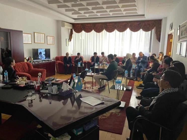وألقى السفير الفلسطيني عميد السلك الدبلوماسي العربي والأجنبي لدى جمهورية كازاخستان، د. منتصر أبو زيد محاضرة أمام طلاب وطالبات المدرسة الدبلوماسية في مقر السفارة الفلسطينية في العاصمة أستانا.