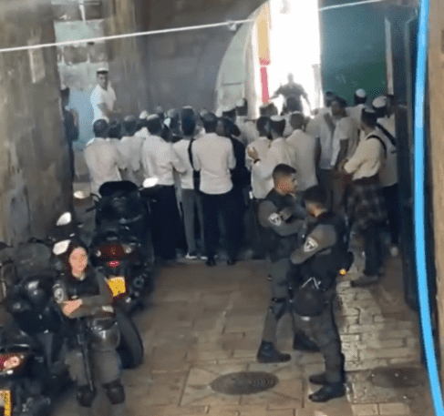 وأفادت مصادر محلية، بأن عددا من المستوطنين تجمهروا أمام البابين، وقاموا بتأدية رقصات وأغانٍ صاخبة في المكان، وذلك بحماية من قوات الاحتلال.