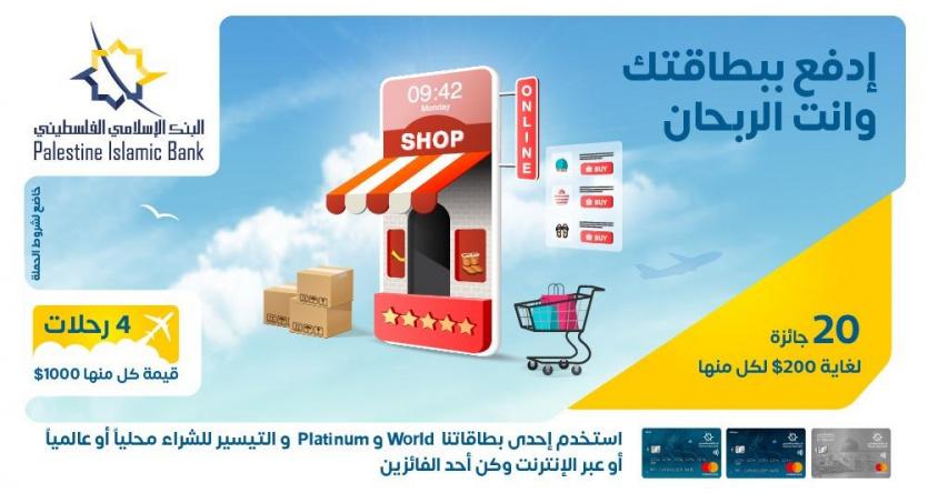 أطلق البنك الإسلامي الفلسطيني حملة مميزة جديدة لتشجيع العملاء على استخدام البطاقات في عمليات الدفع داخلياً وخارجياً والشراء من خلال الإنترنت، سيتم بموجبها السحب على 4 رحلات سفر مجانية بقيمة 1000$ لكل منها بالإضافة لـ 20 جائزة نقدية بقيمة حركة الدفع التي قام بها حامل البطاقة ولغاية 200 $ لكل منها.