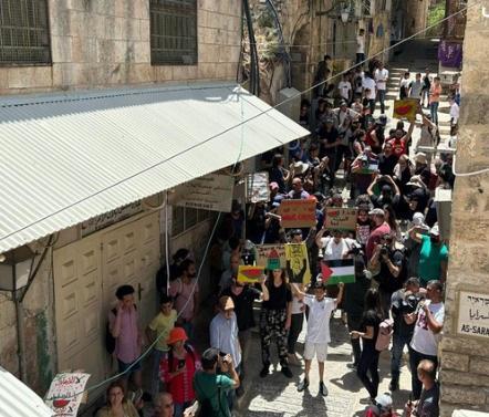واحتشد ظهر اليوم عشرات المقدسيين برفقة متضامنين أجانب أمام منزل عائلة صب لبن في عقبة الخالدية بالقدس المحتلة، رفضاً لقرار الاحتلال بإخلائها من منزلها لصالح المستوطنين.