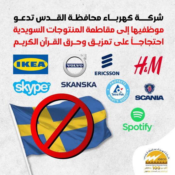 دعت شركة كهرباء محافظة القدس كافة موظفيها في كل فروعها إلى مقاطعة المنتوجات السويدية احتجاجًا على حرق وتمزيق نسخة من القرآن الكريم على يد متطرف سويدي من اصول عراقية.