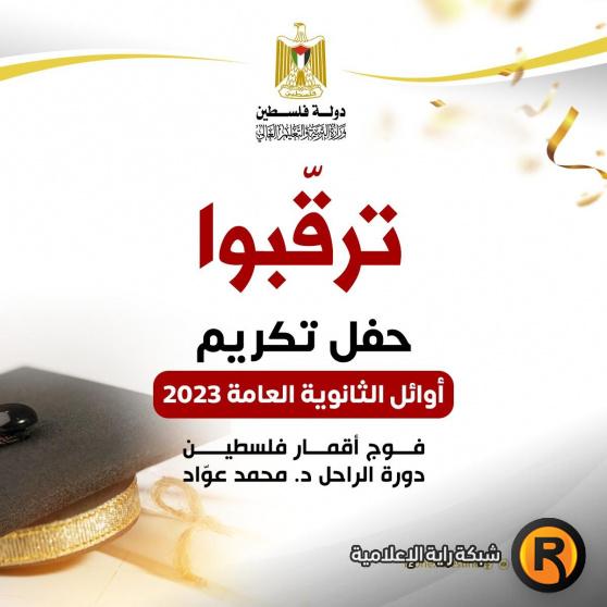 وقالت الوزارة في تصريح مقتضب عبر فيسبوك: "موعدنا اليوم الخميس 20 يوليو 2023 حفل تكريم أوائل الثانوية العامة 2023 فوج أقمار فلسطين الساعة السادسة مساءً في القاعة الملكية بمنتجع الشاليهات على شاطئ بحر غزة".