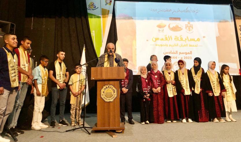 القدس – أقيم ظهر اليوم الاثنين حفل إختتام "مسابقة القدس" لحفظ القرآن الكريم وتجويده – الموسم السادس تحت رعاية مؤسسة قدسنا الوقفية وإدارة الأوقاف العامة الإسلامية في القدس وذلك في جامعة القدس ابو ديس بحضور رئيس مجلس إدارة صندوق ووقفية القدس منيب رشيد المصري ونائب رئيس جامعة القدس الدكتور حسن دويك نيابة عن رئيس الجامعة د. عماد ابو كشك ونائب مدير عام أوقاف القدس مدير عام المسابقة الشيخ ناجح بكيرات وحشد من المتسابقين وذويهم.