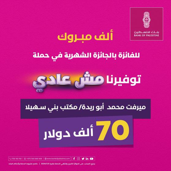 أعلن بنك فلسطين فوز السيدة ميرفت محمد رمضان أبو ريدة من مكتب بنك فلسطين في بني سهيلا بمدينة غزة بالجائزة الشهرية لحسابات التوفير والبالغ قيمتها 70 ألف دولار، ضمن الحملة التي أطلقها البنك على برنامج حسابات التوفير في كافة فروعه المنتشرة بمختلف محافظات الوطن تحت شعار "توفيرنا مش عادي".