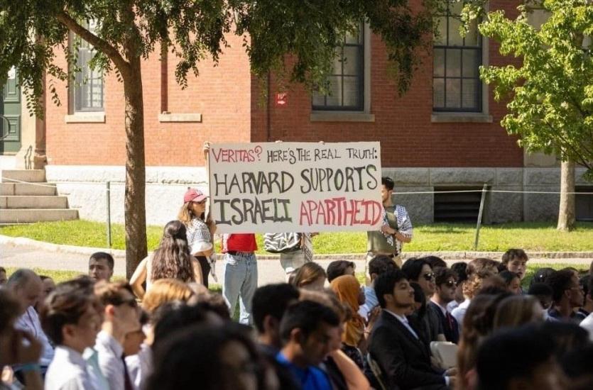 تظاهر عشرات الطلبة في جامعة هارفرد الأميركية، تضامنا مع الشعب الفلسطيني، خلال حفل الاستقبال السنوي الذي تقيمه الجامعة لطلبتها الجدد.