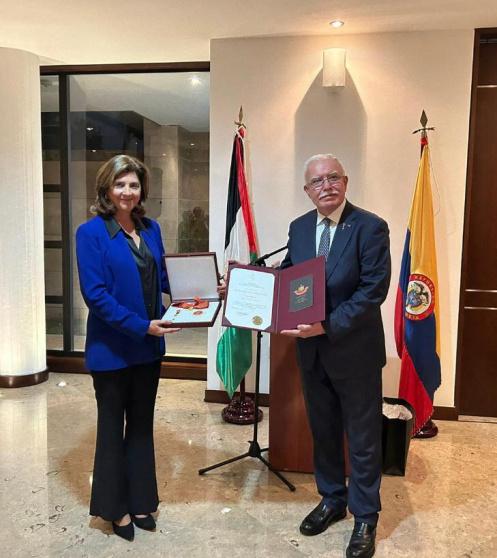 قلد وزير الخارجية والمغتربين رياض المالكي، باسم رئيس دولة فلسطين محمود عباس، وزيرة العلاقات الخارجية السابقة لجمهورية كولومبيا ماريا أنجيلا هولغوين كويلار نجمة الاستحقاق من وسام دولة فلسطين.